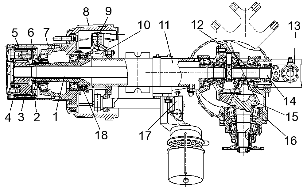 1 — левая полуось; 2 — ступица коронного зубчатого колеса колесной передачи; 3 — водило с кожухом и сателлитами; 4 — солнечное зубчатое колесо колесной передачи; 5 — коронное зубчатое колесо колесной передачи; 6 — гайка подшипников; 7 — ступица заднего колеса; 8 — тормозной барабан; 9 — задний левый тормозной механизм; 10 — датчик скорости с кронштейном; 11 — картер заднего моста; 12 — ведомое коническое зубчатое колесо; 13 — механизм блокировки; 14 — правая полуось; 15 — ведущее коническое зубчатое колесо; 16 — главная передача заднего моста; 17 — регулировочный рычаг; 18 — ротор датчика