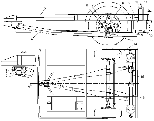 1 — нижняя пластина; 2 — нижняя втулка; 3 — центральный шарнир; 4 — рама пневмобаллонов; 5 — верх основания кузова; 6 — стремянка; 7 — гайка стремянки; 8 — накладка; 9 — пневмобаллон; 10 — шайба; 11 — подушка; 12 — амортизатор; 13 — штифт; 14 — колесо; 15 — штанга; 16 — балка передней оси; Б = (280-300) мм — высота пневмобаллона