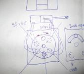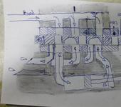 Черновик схемы гидрораспределителя на один цилиндр без предохранительного и перепускного клапанов. Опускание подъём и нейтраль при работающем гидромоторе. В качестве золотника ,ось круглая с поперечными сквозными отверстиями ,и проточками для перепуска на слив .Золотник надо зафиксировать както ,чтоб не вращался.Трактор я не смог убрать.