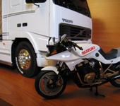 Ну да, примерно как на этом видео:) Только у меня не дергается, а плавно все делает, а тут впечатление как будто дискретное управление. Сниму обязательно, сейчас пока не на что. Хочу снять уже готовый, на улице. Там еще многое предстоит сделать, двигатель полностью будет копия рядной шестерки, производителя еще не выбрал, или “Катерпиллер” или “Камминс” или “Детройт Дизель”. Покраска и старение. Диски черные будут, ржавчина кое где, пыли-грязи немного. По поводу третьего колеса сзади, фото чуть позже сделаю, держится крепко. Длина пепелаца 86см)) Как обычно удлинил раму от Кинг Хаулера алюминиевыми профилями и кардан алюминиевой трубкой. И если видно на фото, они(профиля) идут снизу задней подвески. Немного переделал ее. Как и переднею, но удалось ее сделать практически полностью из стоковых деталей. В амортизаторах пружину переставил, т.е. сопротивление у них теперь при растягивании, а не сжатии. Мотоцикл в масштабе 1:12, склейка от фирмы “Ревелл”, когда давно собирал-красил. Вписался отлично. Фигурка покупная, но доработана, что бы могла двигаться. Коробка передач перевернута(собственно, она и будет копийным мотором) электродвигатель внизу, между рамами, еще потом замаскирую его. Блок управления в ящике, справа от водителя, крышка на петле. Аккумулятор между рамами, сам МФЦ и динамик в спальнике. Передок из полистирола разной толщины склеил, решетки из фильтров. Боковины тоже полистирол и часть от обрезанной крыши другого тягача. Вентилятор от электромотора от блэндера(давно лежал в закромах) естественно, вращается, насажен на моторчик, вибро который, он прикручен к коробке передач. Вибрация тоже осталась, в винте была полость, туда свинца положил и эпоксидкой залил. Руль вращает микросерва, замаскирована под гидроусилитель, голову еще одна микро(спрятана под сиденьем) и переключение передач еще одна микро, на фото видно, но она потом будет спрятана в корпус коробки передач, будет за двигателем, как и положено:) Фото всего этого позже выложу. Фотик разрядился. Спасибо всем за проявленный интерес! Надеюсь не сильно удалился от темы грузовиков, все таки, тут сборка почти полностью на деталях тамиевского тягача, и масштаб, соответственно, тот же.