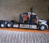 Ну да, примерно как на этом видео:) Только у меня не дергается, а плавно все делает, а тут впечатление как будто дискретное управление. Сниму обязательно, сейчас пока не на что. Хочу снять уже готовый, на улице. Там еще многое предстоит сделать, двигатель полностью будет копия рядной шестерки, производителя еще не выбрал, или “Катерпиллер” или “Камминс” или “Детройт Дизель”. Покраска и старение. Диски черные будут, ржавчина кое где, пыли-грязи немного. По поводу третьего колеса сзади, фото чуть позже сделаю, держится крепко. Длина пепелаца 86см)) Как обычно удлинил раму от Кинг Хаулера алюминиевыми профилями и кардан алюминиевой трубкой. И если видно на фото, они(профиля) идут снизу задней подвески. Немного переделал ее. Как и переднею, но удалось ее сделать практически полностью из стоковых деталей. В амортизаторах пружину переставил, т.е. сопротивление у них теперь при растягивании, а не сжатии. Мотоцикл в масштабе 1:12, склейка от фирмы “Ревелл”, когда давно собирал-красил. Вписался отлично. Фигурка покупная, но доработана, что бы могла двигаться. Коробка передач перевернута(собственно, она и будет копийным мотором) электродвигатель внизу, между рамами, еще потом замаскирую его. Блок управления в ящике, справа от водителя, крышка на петле. Аккумулятор между рамами, сам МФЦ и динамик в спальнике. Передок из полистирола разной толщины склеил, решетки из фильтров. Боковины тоже полистирол и часть от обрезанной крыши другого тягача. Вентилятор от электромотора от блэндера(давно лежал в закромах) естественно, вращается, насажен на моторчик, вибро который, он прикручен к коробке передач. Вибрация тоже осталась, в винте была полость, туда свинца положил и эпоксидкой залил. Руль вращает микросерва, замаскирована под гидроусилитель, голову еще одна микро(спрятана под сиденьем) и переключение передач еще одна микро, на фото видно, но она потом будет спрятана в корпус коробки передач, будет за двигателем, как и положено:) Фото всего этого позже выложу. Фотик разрядился. Спасибо всем за проявленный интерес! Надеюсь не сильно удалился от темы грузовиков, все таки, тут сборка почти полностью на деталях тамиевского тягача, и масштаб, соответственно, тот же.
