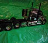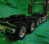 Можно было, конечно, и в “Фото ваших грузовиков”, но решил тему открыть, поскольку процесс доработки не закончен, да и хотелось не только фото, но пояснить что и как, но без фанатизма))). Ну и лишняя тема не помешает, в нашем застойном разделе:) В общем, имеем тамиевские Вольво и Кнайт Хаулер. Что с американцем: вставка в раму 8см, ну и кардан, соответственно удлинен, замена глушаков( полированный алюминий), доп зеркала, немного “облагородил” зад:), ну и всякие финтифлюшки понавешал. Теперь Вольво, тут поболее изменений. Полностью переделана компановка по сравнению с инструкцией: рулевая серва нашла новое укромное место)), коробка заблокирована на первой передаче, вторая серва не к чему; вибрация прикручена к раме, замаскирована)); управление МФЦ-3 так же закреплено на раме; добавлен бак, пневмо резервуар, всякие украшательства. Колонка занимает весь салон, поэтому внутрянки нет, для меня звук важнее. Извиняюсь за сумбурность). Оба тягача не закончены(винтики под лобовым Вольво, конечно, закрашу)), по мере продвижения буду освещать процесс.