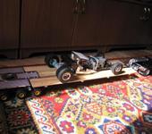 В общем, пересмотрел я концепцию “американца”)) Удлинил еще раму(теперь 81см)), обрезал крышу, убрал наклейки, добавил черного:) Знакомый посоветовал прицепить третью ось сзади, вписалась вроде нормально. Пока просто висит, может потом сделаю рабочей. Ну и по мелочи: антенны, спойлеры, ящики, воздухозаборники на капот… Пока еще в процессе.