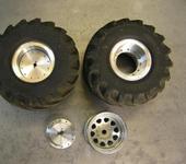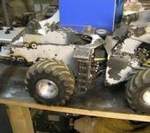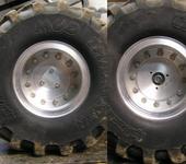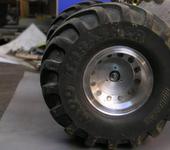 Приветствую. Ещё фото, и краткое описание. Теперь расскажу о новых колёсных дисках и некоторых доработках. Процесс изготовления был не лёгким и не быстрым. В общем было сделано, сами диски, ступицы и прямоходы. С самого начала постройки данной модели уже возникли мысли о переделки самих мостов и изготовления других(металлических дисков). Теперь это реализовано. Напомню что мосты были взяты от ВИЛИ-КИНГА, они хорошо подошли по ширине и по своей форме напоминают мосты настоящего белаза. Но не понравилось то, что на обоих мостах стояли поворотные кулаки а у погрузчика поворот осуществляется за счёт ломающейся рамы. Да и сами поворотные кулаки имели не приятные люфты. Прямоходы вытачивал из дюрали. В каждом запрессовано по два подшипника. Крепление к корпусам по родным отверстиям. Ступицы так-же дюраль. Посадка на оси сразу на шпильку минуя шестигранники. Диски состоят из трёх частей. Две половинки дюраль и распорное кольцо стальное, многим известная схема. Размер 2,2. Ещё в колёса вставил вставки, так-как изначально были пустые и при хорошо за груженом ковше покрышки продавливались почти до диска. В общем с колёсами практически всё за исключением заглушек на гайки крепления ступицы и покраски . Хорошо было-бы покрышки сменить на более копийные и без таких надписей. Но как говорится на скорость не влияет и по возможности заменю.