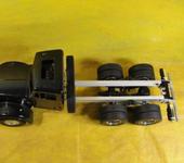 Опытным путём методом “тыка” на родной раме 1/14 TAMIYA KING HAULER сдвигаю тележку двух ведущих мостов (проходной средний и задний) вперёд к кабине, также сдвигаю вперёд к кабине самосвальный кузов 1/16 BRUDER 03550 SCANIA, тем самым убрал просвет - лишнее расстояние между кабиной и кузовом, оставил в этом промежутке только два запасных колеса расположенных поперёк рамы. Убрал два ящика с подножками слева и справа под дверями кабины, на их место передвинул вперёд два топливных бака, на баках есть ступеньки для подъёма водителя и пассажира в кабину. Вот, как-то так, всё на своём месте, ничего лишнего, так будет выглядеть 1/14 TAMIYA KING HAULER dump truck (самосвал) окончательно, теперь надо расчитать длину лонжеронов, чтобы изготовить новую раму.
