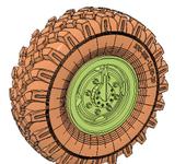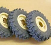На сегодня практически закончил с покрышками. Вот что получается (сфотографировал уже с изготовленными для колес дисками и надо еще “подчистить” сами покрышки от приливов от формы). Статья про их (покрышки) изготовление на ссылке выше.