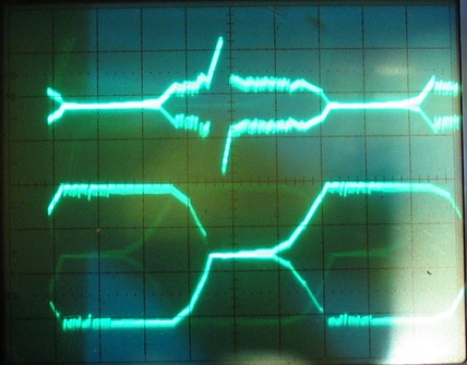 - Второй канал подключите сначала к одному измерительному резистору, затем к другому. Осциллограммы сигналов должны быть сдвинуты по фазе на 90 градусов, примерно как на картинках (см. приложение). Там видно, что работает внешняя синхронизация (прорисовка осциллограмм начинается в одном месте экрана) и сигналы сдинуты на 90 градусов.