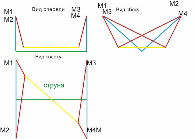 Как мы видим точки подвеса на виде спереди/сверху сходятся вызывая подьем нити и изменение координат по y1y2 вместо того что бы они остались на прежнем месте.