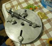 Снизу так сказать планшайбы запресовано несколько подшипников, а расточная головка, если ее так можно назвать, выполнена с переходной посадкой. Кусок сверла на 6 переточил в резец (есть регулировка вылета сверла, но только в одну сторону на вылет) и алюминий строчит это хозяйство как по маслу. Вчера испытал ее не по назначению, убрал одну базу и крепил эту приспособу прямо на “ухо” станины. Одел на расточную головку кусок шланга вместо муфты, а второй конец в дрель и расточил четыре отверстия в станине под фланцы которые прежде были вырезаны коронкой по дереву с их малой доработкой. Так вот удалось расточить отверстия в один размер и относительно друг друга на расстоянии 0,5 м с попаданием не более чем в 0,3 мм, это с учетом того, что зазор между фланцем на регулировку его относительно станины был заложен 1 мм, а оказалось что можно было и 0,5 “за глаза”. Эта расточная головка получилась для отверстий минимум 34 мм, теперь сделаю себе еще одну для более мелких отверстий 14 мм и более.