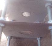 Были вырезаны 4 отрезка металла по 17 см., в 3-х из них проделаны отверстия, каждое отверстие уникально ( Для фитинга 35 мм., для рейки 43,5мм и для верхней части по шаблону) и по 4 отверстия под шпильки в каждой детали. Не имея станков под рукой отверстия делались с помощью дрели и шлиф. машинки. Под словом шаблон скрывается прикладывание рейки и разметка.