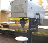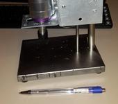 Станина и подвижный кронштейн отфрезерованы из стали, подш. узел выточен из стали, на кронштейне закреплен эл. двигатель 220 В. Подвижный столик и напр. вал выточены из нержавеющей стали. Передача от двигателя к сверлу осуществляется резиновым пассиком через шкивы, имеющие по 3 ручья. Это позволяет иметь 3 скорости вращения, скорость меняется вручную перестановкой пассика.
