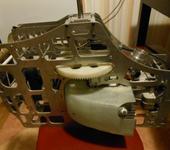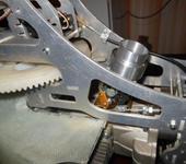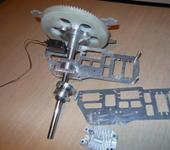 Главная передача. Момент вращения на главный вал передаётся через угловую передачу. Ведущая шестерня(сталь) 20 зубов, ведомая (капролон) 95, модуль 1.75. Главный вал D=12мм, на котором на шпонке сидит ведомая шестерня, вращается в 4х подшипниках. В верхнем блоке 2 радиальных и 1 упорный, в нижнем радиальный. К верхнему блоку подшипников крепится сервотрэй и блок стоек. Блок стоек позиционирует блок подшипников относительно рамы. На фото показаны детали автомата перекоса. Пока “боевые сервы” в пути из ХК есть некоторые вопросы по плечам рычагов. Поэтому АП пока в таком состоянии. На фото показана установленная газовая серва для подгонки боудена к карбу и для пробных запусков.