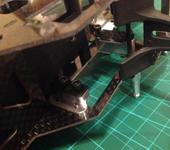 Переходники для сервомашинок являют собой сомнительные инженерные решения. Производителю пришлось решать следующий вопрос – отверстия для крепления сервомашинок у мини перекрывают отверстия от стандартных. Т.е. напилить доп. отверстий не представляется возможным и тут включается фантазия разработчика. Для тангажа и крена используется переходник с потайными винтам, а сама сервомашинка зажимается карбоновой плашкой. Отверстия в самой сервомашинке не используются для крепления… Тут кстати меня ждал сюрприз. Потайные винты достаточно короткие, а у одного из креплений «в самом начале» резьба была сорвана. Пришлось искать аналогичный винт, но с более длинной резьбой.