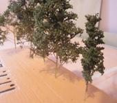 А это натуральный кустарник какой-то. Он в меру прочен, хотя при усилии можно конечно сломать. Для постановки на макет использовал булавку с клеем вставленную в ствол. Сначала красил аэром стволы в коричневый цвет, потом обрызгиваем кроны клеем спреем и трясем присыпку на кроны. Готово.