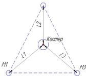 …Принятые коптером уровни сигналов с маяков (М1-М3) будут пропорциональны расстояниям L1-L3(при условии точной калибровки мощности сигналов маяков). И мы сможем точно позиционировать аппарат…