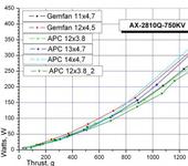Сделал “комплексный” (с пропами, которые есть в наличие) тест AX-2810Q-750KV (HK 40A BS, timing-High, start-ACC). Все пропы – пушеры (ну так моторчик к регулю подпаял).