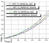 Прошил HK 40A BlueSeries последней для них (bs40a.hex 2012-09-30) SimonK – прошивкой. Разницу проверил на стенде – в попугаях граммах тяги на Ватт. Батарея перед тестом заряжалась до 16.8V. Мотор AX-2810Q-750KV, пропеллеры APC SF – 13x4.7 и 12x3.8. Возможно, timing-High, start-ACC – это были не лучшие настройки для этих регуляторов, но стоковые timing-AUTO были еще хуже. Заодно, еще раз получилось, что для этого мотора 12-й размерчик – эффективней работает.