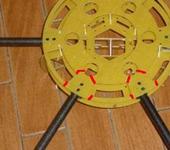 Дырки можно сделать и дрелью на коленке, только больше размером. Потом если сделать бутерброд из стеклотекстолита или угля плоского и упругого вспененного пластика (не знаю породу- что то раза в 3 плотнее старорежимного мышкиного коврика), потом стянуть ,то получится демпфирующая сборка. Крайне рекомендуются растяжки между лучами. Пока их не было, видел разок погнутую трубку после крэша. Регулируется под характер, как аморты на багги.
