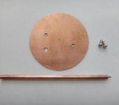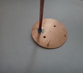 Из фольгированного стеклотекстолита делаем экран диаметром 40 мм, сверлим крепёжные отверстия и отверстие под питающий кабель. Припаиваем кабель и разъём. Из меди толщиной 0,5 мм (можно и жести ) делаем согласующую линию ( тот четвертьволновый согласующий трансформатор из калькулятора мне не нравится ).
