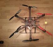 На мозгах open pilot без доп. настроек и регулировании вращения оборотов двигателей, они одновременно стартуют и равномерно взлетает вверх. Правда, в сравнении с naza нет устойчивости в воздухе. Вес итоговый без ног составил 1500г.