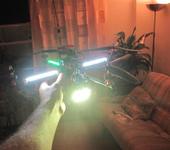Мозги здесь стоят MK 1.3. ГПСа нет, барометр есть, флипы умеет. Моторы перемотаны одножильным проводом на 700кв. (Почему не взял готовые? Просто знаю эти, пользовался ими раньше, отличные магниты, легкий. А КВ дело поправимое). Пропеллеры GWS 9050x3. Полная тяга 1050 грамм. Без навесок летает 23 минуты на батарее 1500 3S, в максимальной конфигурации (ночное FPV и все время включенная передняя фара) 10 минут. Мощность видеопередатчика 400мВ, 1280Мгц, камера (какой-то Панасоник)стабилизирована по двум осям.