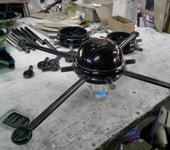 Шляпа фиксируется просто на липучке, цели увеличивать жёсткость за счет крепления шляпы не было, дальше планируем вообще шляпу делать вакуумным формование из поликарбаната, жесткость конструкции придает полка крепления приемника,контроллера, и БЕКА Назы. На первом экземпляре собранном, вообще не усиливал не чем , хотелось ваяснить достаточно ли жесткости, идея была такая при средних ударах рама должна с демпфировать, если будет слишком жесткая что-нибудь снесет точно. Вот фотки первого собранного изделия Размер 700мм между двиг. двигатели Т-мотор 2814 к/В 710, регулы Хай-модел - профи 30ампер( с назой запустились нормально), винты 12/4.5 , контроллер НАЗА, аккамулятор нано-теч 4.5 ампер. Весу много нагнал радиаторами надо поменьше их хватает за глаза, и ноги надо формованные они уже в процессе исполнения, те что сейчас стоят пластина д-16т тяжеловаты. В итоге вес получился 1530 гр. Новая будет легче. Летные испытания прошли успешно квадрик без моего участия летат гораздо лучше чем когда я им рулю. В итоге из 5 полетов в трех минус 8 винтов. Пробывал его об планету с высоты до двух метров так ничего все получилось достаточно крепко. Вот видюха крайнего полета, качество правда дрянь снимали мыльницей , да и руки у жены дрожали почему-то. в предидущем полете мимо нее пролетело пару лопостей от двух поломанных винтов- не пойму что она так разволновалась.
