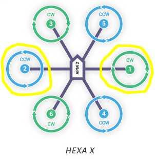Начал тестировать конфигурацию X гексы с 12ю моторами на АПМ. На каждом луче сверху двиг 5010 288kv 18x6.1, внизу 5008 330kv 18x6.1 проп. Пропы крутятся в разные стороны, если сверху на ВМГ смотреть.