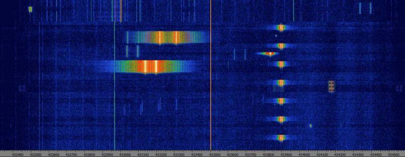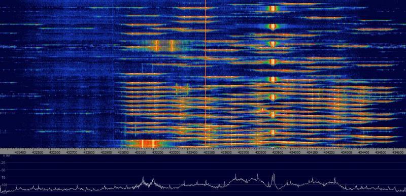 Радиоэфир на 433МГц, виден всякий мусор - сигналки, еще что-то там