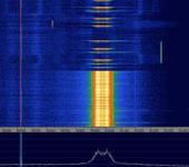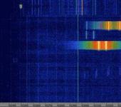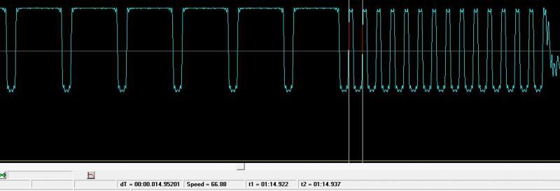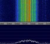 Видно что полоса у него довольно-таки узкая, что с одной стороны плюс, зато и скорость поменьше будет. В начале видны посылки, идущие до установления связи. -