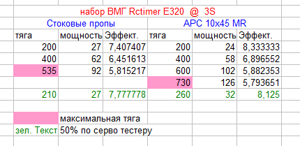 Кстати, обратите внимание на зеленые строчки в табличках… В двух нижних видно разницу в зависимости от размера пропа, при разнице в один размер тяга выросла в полтора раза, а при разнице в два размера - тяга увеличилась тоже в два раза… И это не калькулятор, это реальные результаты тестов со стенда.