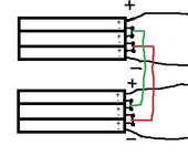 Денис, миль пардон, но Вы похоже совсем не понимаете как это работает… Нарисуйте такой же рисунок, только напишите на каждой банке её сопротивление, ЭДС и напряжение под эталонной нагрузкой. Потом возьмите школьную физику и калькулятор и посчитайте какие токи и напряжения будут при различных подключениях…