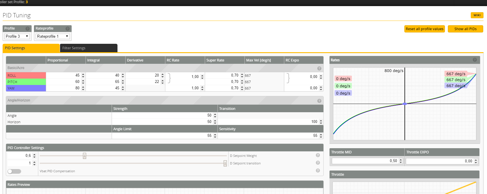 На дефолтных настройках пидов коптер летает отлично (2212-920, 3S, пропы 9443). Ради интереса и изучения вопроса вывел на крутилку Rate Roll/Pitch kP, но особой разницы не замечаю: что на дефолтных 0.15, что на повышенных 0.20, что на пониженных, летает одинаково - но всё на батарее 3S. Как только ставлю 4S, сразу жуткие осцилляции, приходится понижать крутилкой kP, чтобы коптер не дергался, как в припадке. Так и должно быть? Нужно менять пиды, когда перевтыкаю то 3S, то 4S?