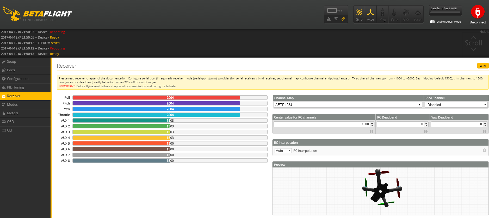 В общем при подключении по USB к контролеру sp racing f3 программой cleanflight во вкладке RECEIVER активны только 2 канала ( AUX1 и АUX2) при шевелении правым стиком. все больше ничего не работает не рол не пич не яв.