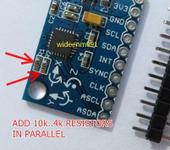 ВНИМАНИЕ! Шина I2C предполагает подстройку подтягивающими резисторами. Если у вас длина провода до сенсора не больше 20-30см и это обычный провод, то все ок. Если у вас длина больше 30см, или провод очень тонкий и экранированный, то емкость шины возрастает и нужно УМЕНЬШАТЬ номиналы подтягивающих резисторов. Есть специалные формулы, где нужно мерять емкость провода. Но проще подбирать номинал, начиная от 10к и постепенно уменьшая до 2к, пока ошибки I2C в ГУИ полностью не исчезнут. Резисторы лучше паять на сенсор (подтяжка к 3.3В) паралельно тем, что есть. Найдите дорожки от входов SDA, SCL к резисторам на 3.3В, и поверх них напаяйте новые (можно и паять взамен, подобрав номинал чуть меньше).