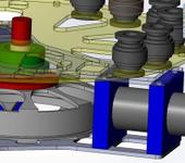 Далее на мотор прикручивается вал (красный на рисунке). В нужном месте он с 12-ти мм переходит на 10 мм и в это место одевается подшипник. Он вставляется во втулку (зеленая), которая упирается в верхнюю пластину. Далее дистанционная втулка, шайба и все затягивается гайкой уже в пластине виброразвязки