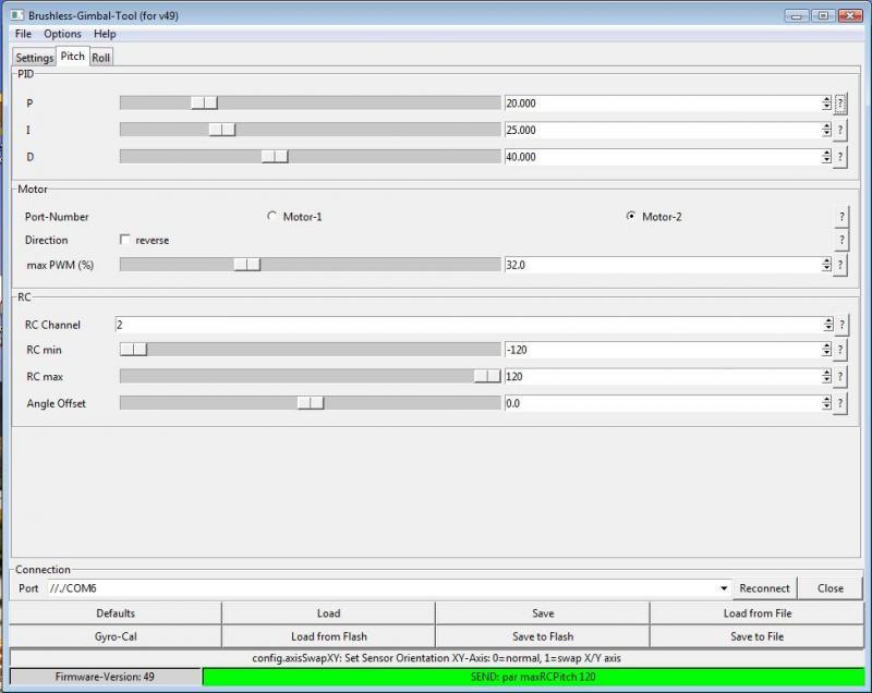 Если Вы имели в виду настройки по питчу и роллу, то они сугубо индивидуальные, зависящие от моторов, веса камеры, балансировки, трения в подвесе. А если по поводу ориентации датчика. То эти настройки в закладке settings. Там можно поменять ориентацию оси Z (установка датчика вверх или вниз тормашками) оси X Y (разъемом вперед или назад)