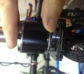 Стопорное кольцо потеряно. Смотреть со стороны, с которой мотор крепится на раму. На валу канавка. В ней должно быть пружинное стопорное кольцо, а под ним - шайба.