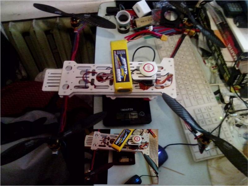 Полетный вес конкретно этого - 1 кг. Ну там потом ставится еще FPV 0.5 Вт, GPS, FullHD камера и прочий фарш.