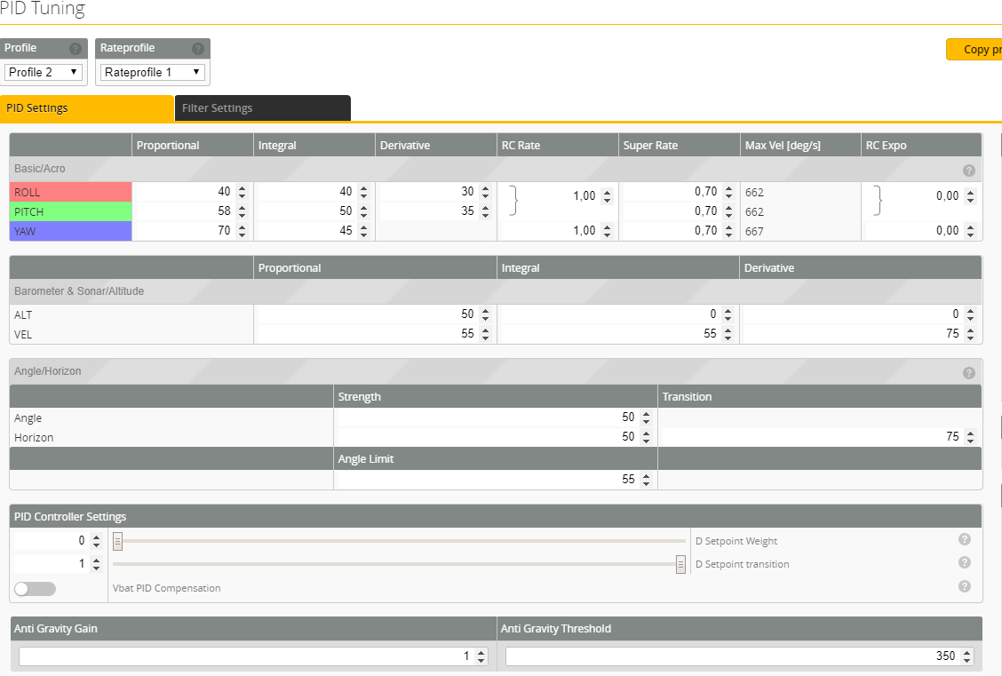 У меня тоже вопрос по пидам. Подскажите под мой сетап примерные настройки. 2212 моторы, 10 винты, 4s, рама Х образная.
