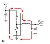 Первое что нагуглил. Принцип работы простейший - Q2 и Q3 открываются по-очереди, с определённым соотношением времени открытия. Если 50%:50%, то в среднем на выходе будет половина от напряжения питания. Т.е. 5V*50%=2.5V. Но это в среднем, а фактически же идут импульсы по 5V. Дальше стоит LC-фильтр низкой частоты, который весь этот ВЧ на частоте ШИМ отфильтровывает, и остаётся только постоянная составляющая - те самые 2.5V уже постоянного напряжения (на схеме указано напряжение под заполнение в 100%*1.5V/5V=30%+потери в преобразователе). Получается, что заполнением ШИМ мы можем плавно перестраивать выходное напряжение. При этом потерь как в реостате - нет. Просто верхний ключ долбит дроссель импульсами такого же тока, как ток на выходе преобразователя (система сама входит в состояние такого равновесия), а когда закрывается - дроссель сопротивляется изменению тока и продолжает его поддерживать уже через нижний ключ, являясь в эти моменты времени источником ранее накопленной лишней энергии. Конденсатор на входе преобразователя (C2) берёт на себя импульсную нагрузку от Q2, и источник питания “видит” уже усреднённый ток. Т.е. 1A на выходе, умноженный на время открытия верхнего ключа (50%) = 0.5A. Вот и получается, что потребляемая мощность равна выдаваемой, при уже разных напряжениях. Этот преобразователь работает в обоих направлениях (если нагрузка начнёт давать ток - он будет повышаться до 5V и идти в источник питания - рекуперация), и больше всего напоминает трансформатор, только работающий с постоянным током и с возможностью плавной перестройки коэффициента трансформации. Главную роль тут, конечно, играет дроссель, который сглаживает броски тока. Конденсатор C3 всего-лишь сглаживает напряжение, т.к. нас тут интересует не ток, а напряжение. Он тут вспомогательный, как и C2. Так, основу объяснил, теперь понятнее будет вот это: