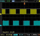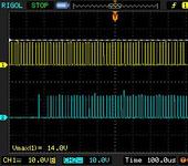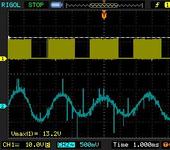 Скважность в обоих каналах почти одинакова потому, что мотор был не нагружен. А вот при замере формы тока я его тормозил, иначе все плоское и виден только шум. Коэффициент для перехода к значению тока около 33 А/в.
