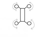 Добавлю ещё несколько моментов, по задумке сам корпус аппарата не меняет свой угол наклона, как это происходит у большинства квадро(и больше)коптеров. Перемещение должно осуществляться наклоном двигателей, однако при горизонтальном перемещении он не превращается в самолёт, как тот же Bell V-22 Osprey. Наклон двигателей может осуществляться как показано на корявой зарисовке из paint