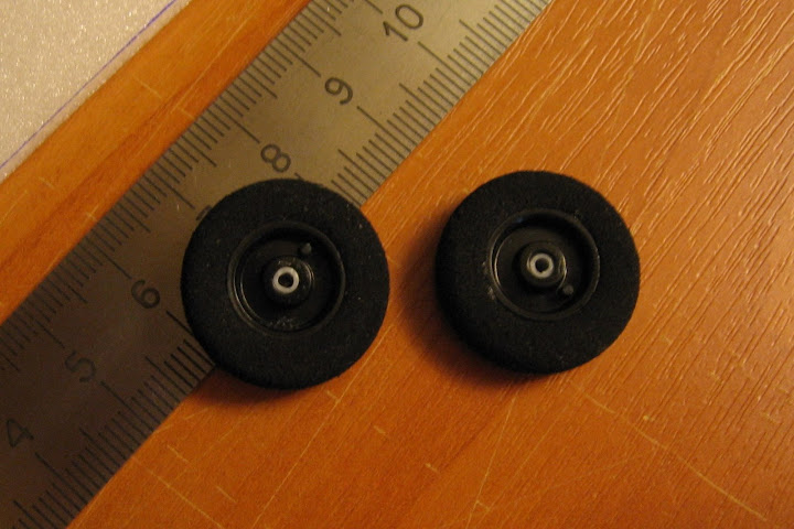 Колеса вот от такого бипланчика, очень легкие, бальзовые.