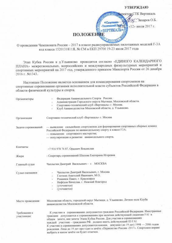 Дорогие друзья и коллеги ! Спешим сообщить , что чемпионат России не за горами , и поэтому просьба всех желающих принять участие в нем зарегестрироваться здесь . В программу полётов и состязаний традиционно входит комплекс P и если будут желающие , то и комплекс C . Просьба регистрироваться и желательно отослать ваши данные с фотографией сюда oryshich@rambler.ru . Соревнования пройдут в следующих дисциплинах : взрослые(чемпионат России ) , юноши (первенство России , до18 лет) , новичок ( комплекс C ) . Также принято решение о финалистах чемпионата России : в финал пройдут 50% от заявленных участников . Соревнования пройдут в два дня на аэродроме Ульянково , мытищинского района .