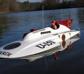 Можно классифицировать эту модель как FSR-H. А про скорость… Могу сослаться на сетап одного весьма известного (в Америке) мужичка, который на моторе со стоковым глушителем разонал эту модель до 60 миль в час. Но наверняка вода была зеркально гладкой и это было не в гонке. Ну и топливо с 65% нитрометана. =)
