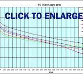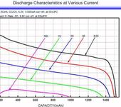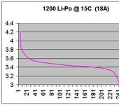 Кстати, порылся в записях - нашёл-таки хотя-бы один график с семейством разрядных крывых - он старый, но позволит ЭДС полимера в середине разряда хоть примерно вычислить - на нем кстати характер кривой на 5С сильно напоминает характер кривой 15С на PQ-XP - что говорит о трехкратном снижении внутр сопротивления с тех пор (2003 год). По ентим кривым сопротивление древних литиев получается от 0,05 до 0,095 V/С - оно разное для разныз промежутков и максимальное как раз около 5 С тока ( 1 Ом=1 Вольт/1А, а тут вместо абсолютных Амперов относительные С, которые при емкости в 1 А/ч как раз будут Омам и равны). ЭДС получилась 3,8 вольта по центру разряда. Если предположить равенство ЭДС старых и новых литиев и аналогичный характер зависимости внутр сопр от величины разр тока - тогда на 15С внутр сопр будет 0,0233 V/C, и при 30С оно будет в 1.5 раза меньше (предположительно из-за саморазогрева батареи) =0,0155 V/C. С учетом ентих предположений величину напряжения при первой оценке (25 декабря) я немного завысил - она вместо 3.4 Вольт должна быть около 3.2-3.15 вольт. Подстановка в Ексель 3,2 вольт дает 3,613550816 Вт/Грамм, и 8% превосходство PQ-1500 XP над СЕЛЕКТИВНЫМ 1 мОм Гидридом 4200 весом 65 грамм на токе 48С=200А.