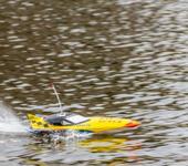 Лодочка, правда без особого энтузиазма, даже выходит на глиссирование, особенно хорошо, эффектно и быстро это получается, когда ведешь ее по овалу по часовой стрелке. Против часовой как-то неохотно идет и рулится также. Скорость не измерял пока, на полном газу вроде, как для меня, идет вроде неплохо. Пока как-то не очень ловко “рулю”: иногда она в повороте на скорости срывается и делает разворот на 180 градусов. На полном газу пока не ходил, боялся перевернуть.
