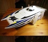 Регуль в мусорку, аппаратура туда же, мотор пока дышит. Все что дальше мотра поменяно на тюнинговое, дейдвуд, вал, струт, рудер. Сейчас на 4s, винт 40 на 1.4 летает очень быстро, чуть не взлетает. Корка треснула сама, была заклеена, отвалился кусок шпаклевки, тоже заклеим. Так что вывод- оно надо покупать лодку в которой надо на 90% все менять. Это вам инфа по лодке из абс.