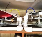 Заодно поставил новые винты! Винты самодельные. Возможно их ещё придётся допиливать, посмотрим… На фото ниже две кормы, белая Зонда с винтами 948 и красный Мистик с винтами 48 на хххх (рсчётный питч 2,3-2,5). Шнеки, короче! 😃 Винты(лопасти) получились хоть и относительно тонкие, но на порядок жёстче “китайлюминя”! Хотя тоже из китайских болванок…