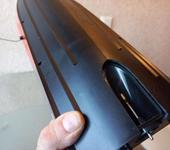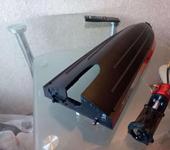 Всем привет! Ну, в общем вроде бы получилось! Ситуацию вырулил, хотя были панические настроения и желание заказать новый корпус. Но обо всём попорядку. Сначала я подогнал вырез под водомет в корпусе, всё было прекрасно, пока ко мне в голову не пришла одна коварная мысль. А именно, раз корпус из полистирола, то можно нагреть его феном и аккуратно осадить на простешем паунсоне. Сделал паунсон из 10мм фанеры, выставил на подставочке, нагрел феном и прижал ровным кусочком фанерки. Всё вроде бы получилось, но образовался небольшой бугорок, неровность. Решил его убрать этим же способом. Но, лучшее, как известно враг хорошему. В результате уплыла геометрия, ушли размеры вырезанного отверстия, у меня сделались нервы, я попытался исправить ситуацию… В общем сегодня вырезал из куска полистирола заплату, приклеил, заодно выставил ось водомёта паралельно оси катера. Осталось исправить транец, т.е. скорректировать отверстие под сопло. А дальше дело техники, установка сервы, место под акк и т.д.